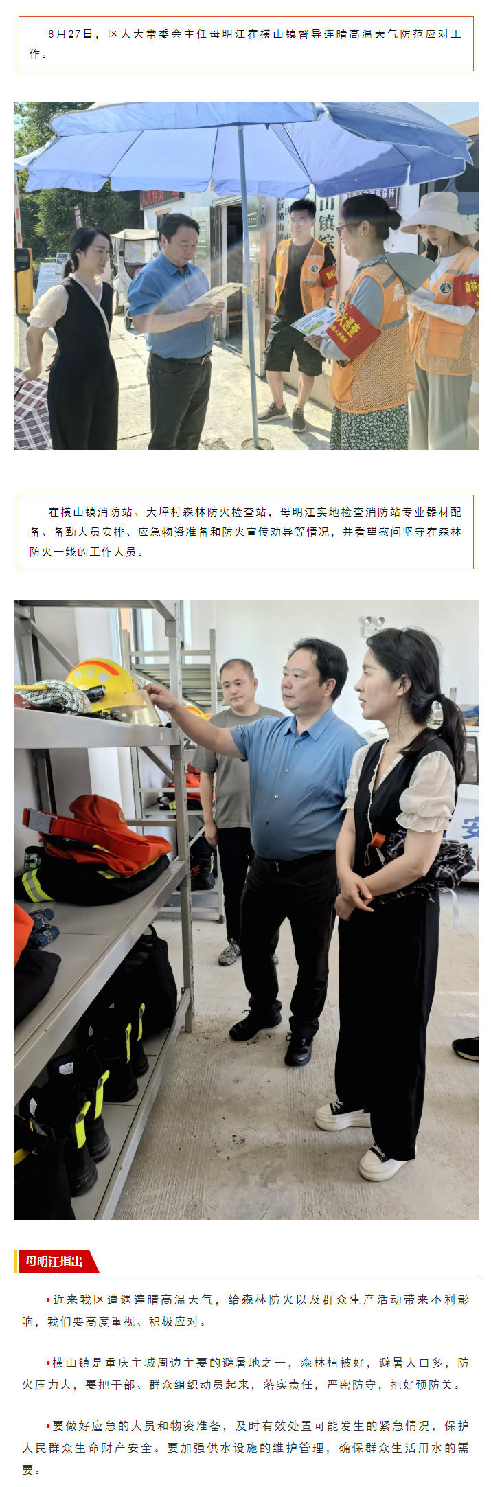 母明江到横山镇督导连晴高温天气防范应对工作