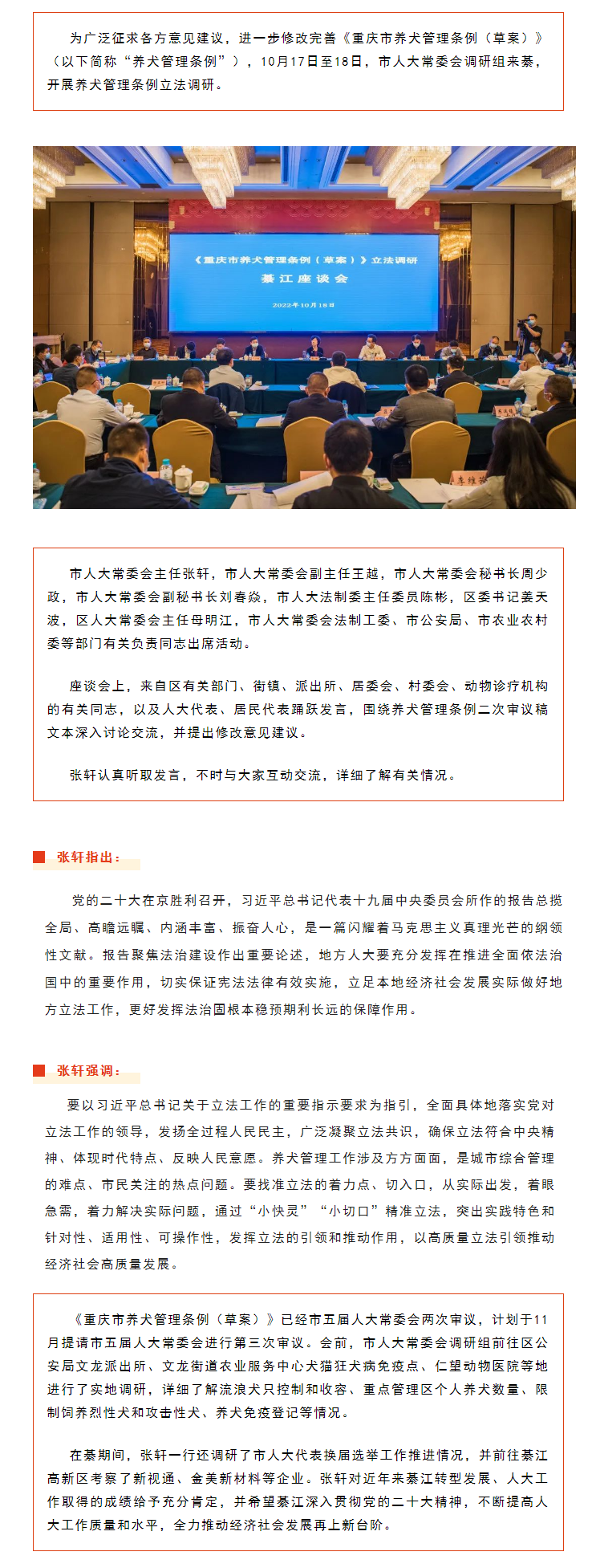 市人大常委会主任张轩率队来綦开展《重庆市养犬管理条例(草案)》立法调研