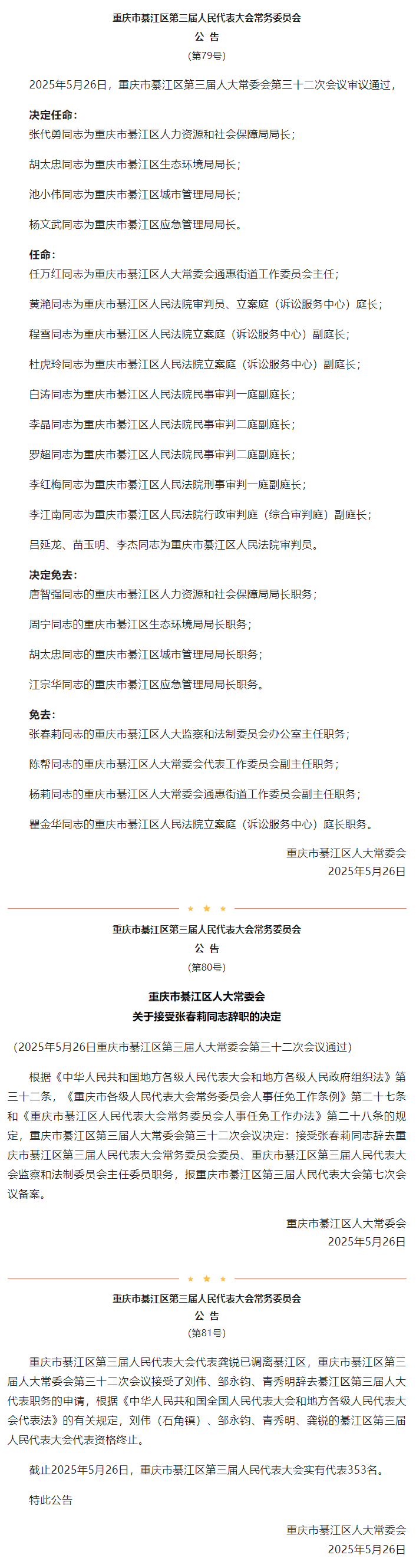 重庆市綦江区第三届人民代表大会常务委员会公告(第79-81号)