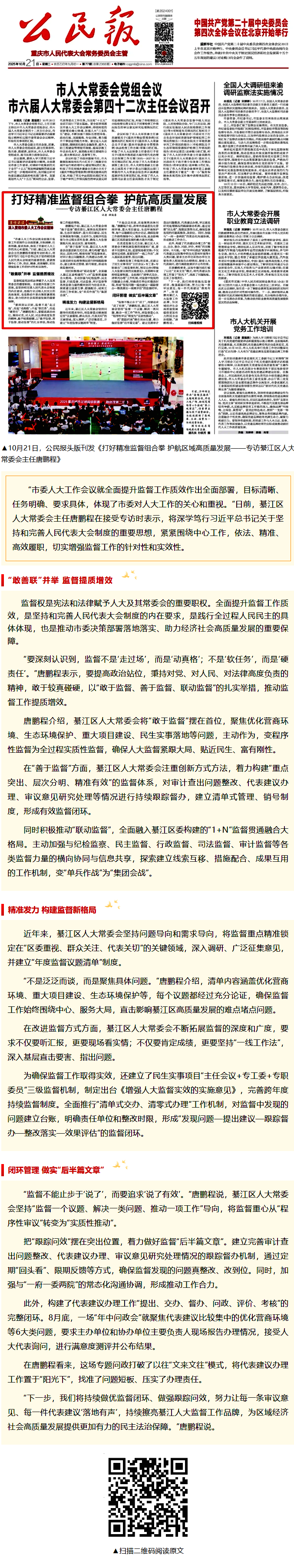媒体·聚焦丨公民报:打好精准监督组合拳 护航区域高质量发展——专访綦江区人大常委会主任唐鹏程